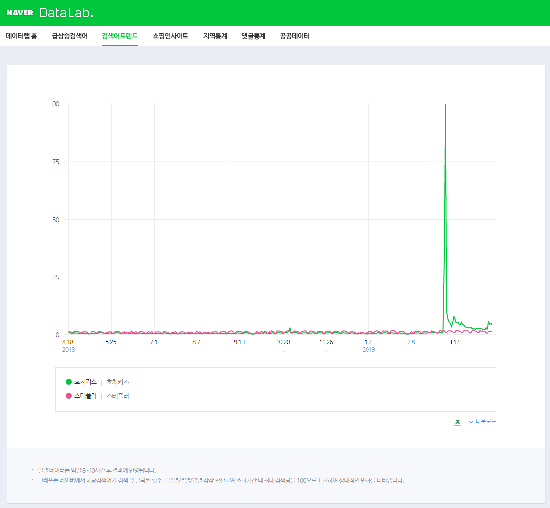 3월 입학시즌과 새학기를 앞두고 호치키스의 검색량이 폭발적!!!!!으로 증가하는 것을 볼 수 있다.