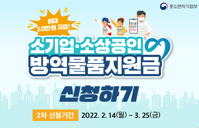 방역패스 의무 도입에 동참한 소기업·소상공인의 부담 완화를 위한 방역물품지원금 2차 지급 신청입니다. 신청조건 : 아래 기준을 모두 만족하는 소기업 · 소상공인 - 신청일 기준 휴·폐업 상