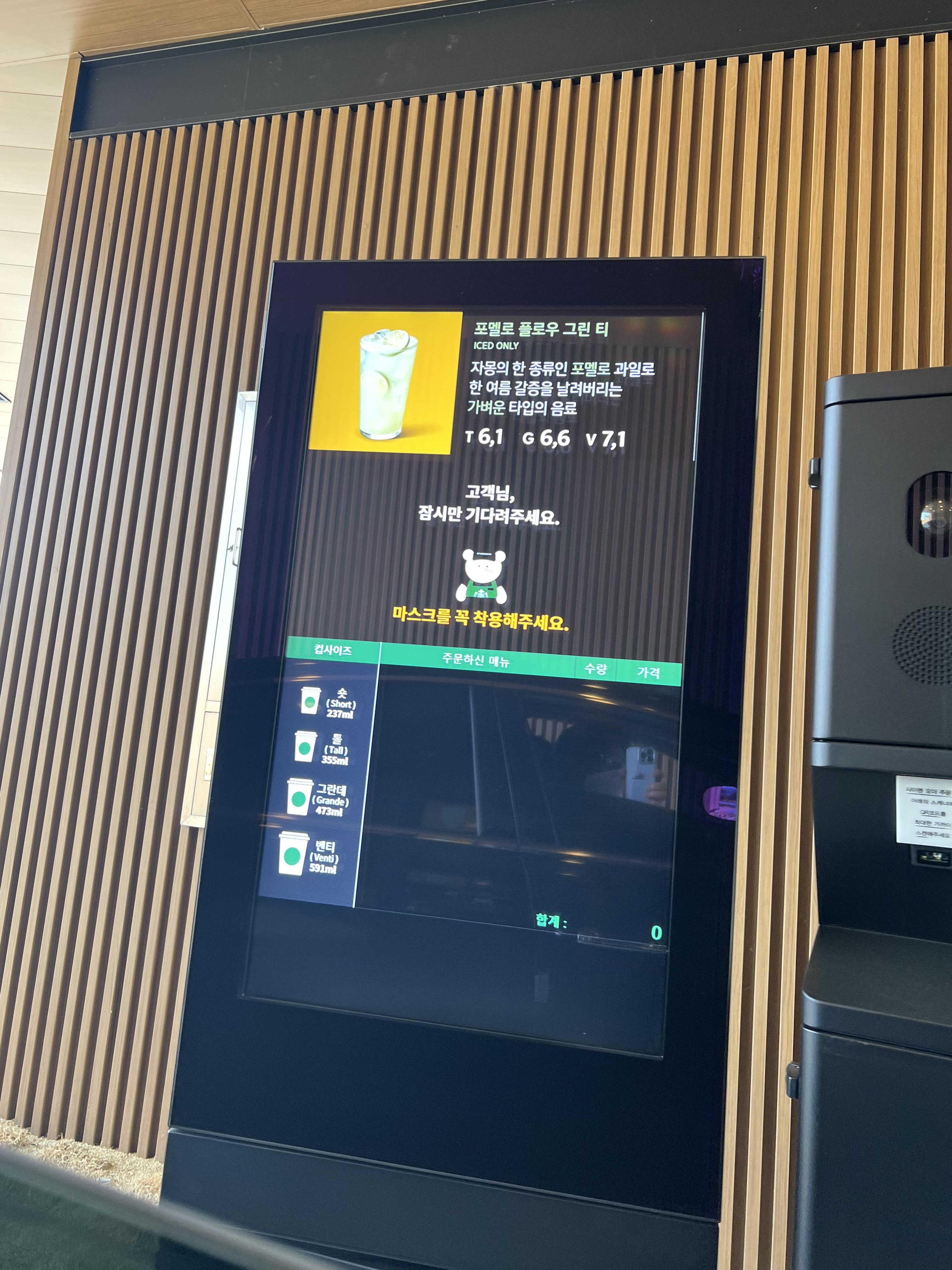 차량인식 자동 결제 시스템이 도입되어 스타벅스 카드로 차량번호를 연동시켜 차량이 진입시 번호판을 인식하여 주문이 된다.