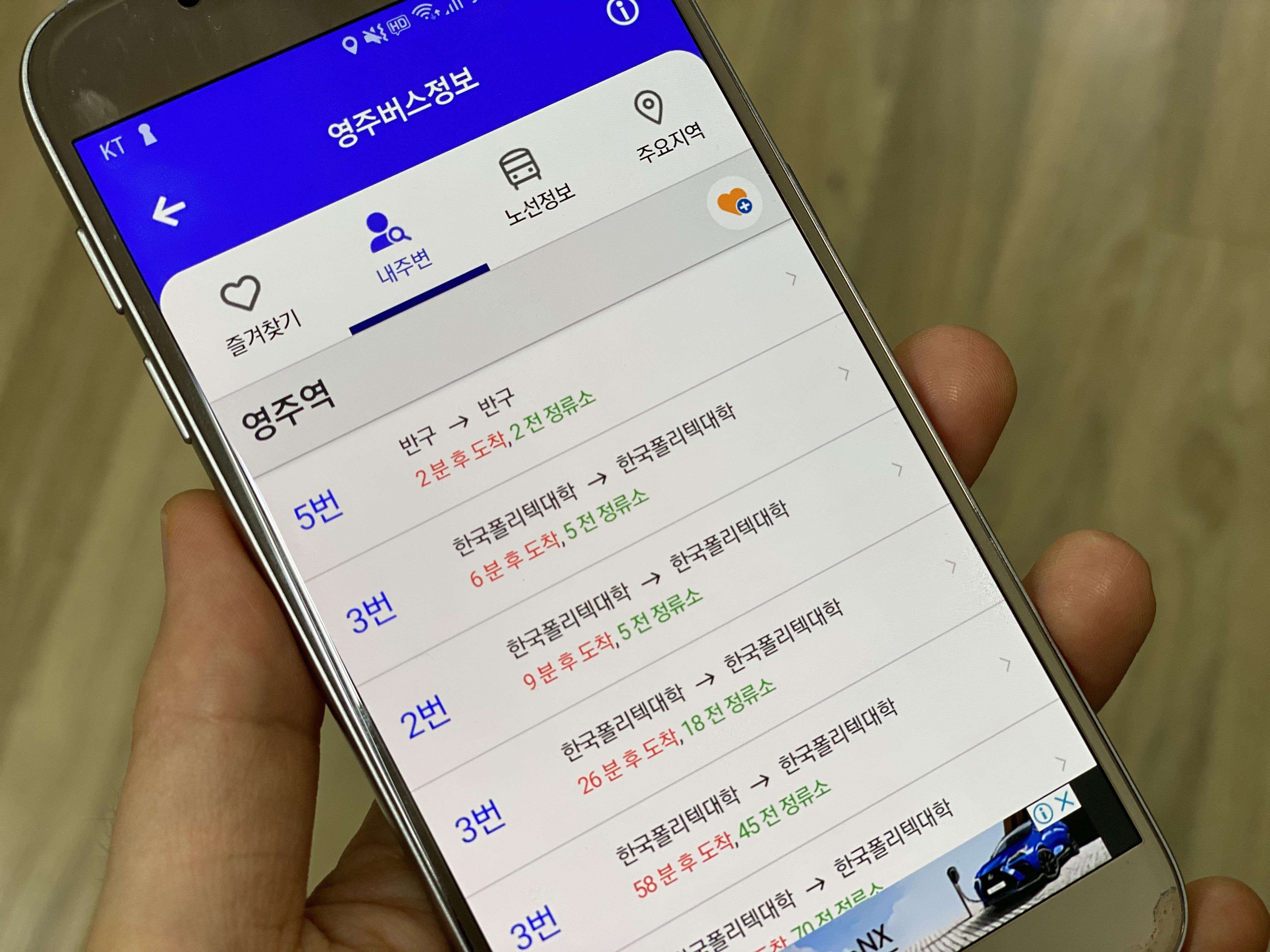 영주시에서 제공하는 교통정보(DB)와 국가대중교통정보센터(공공데이터)를 이용하여 제작된 앱으로 운행중인 시내버스의 실시간 위치 및 정류장 도착 정보를 제공한다.