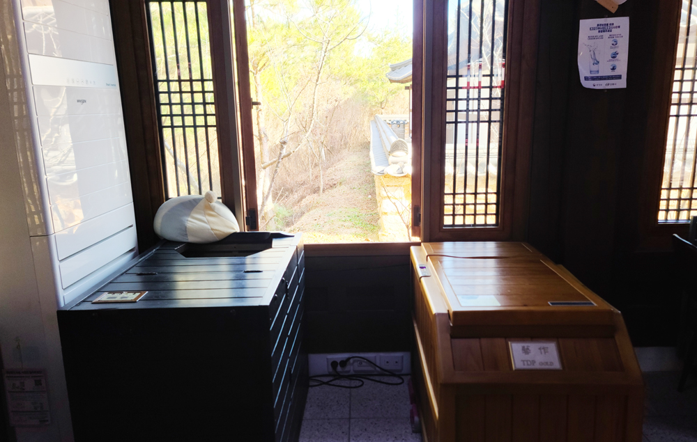 뚜껑을 열고 나무 통 안에 들어가 앉은 다음 뚜껑을 닫는 훈증 방식의 건식 반신욕인가봅니다.