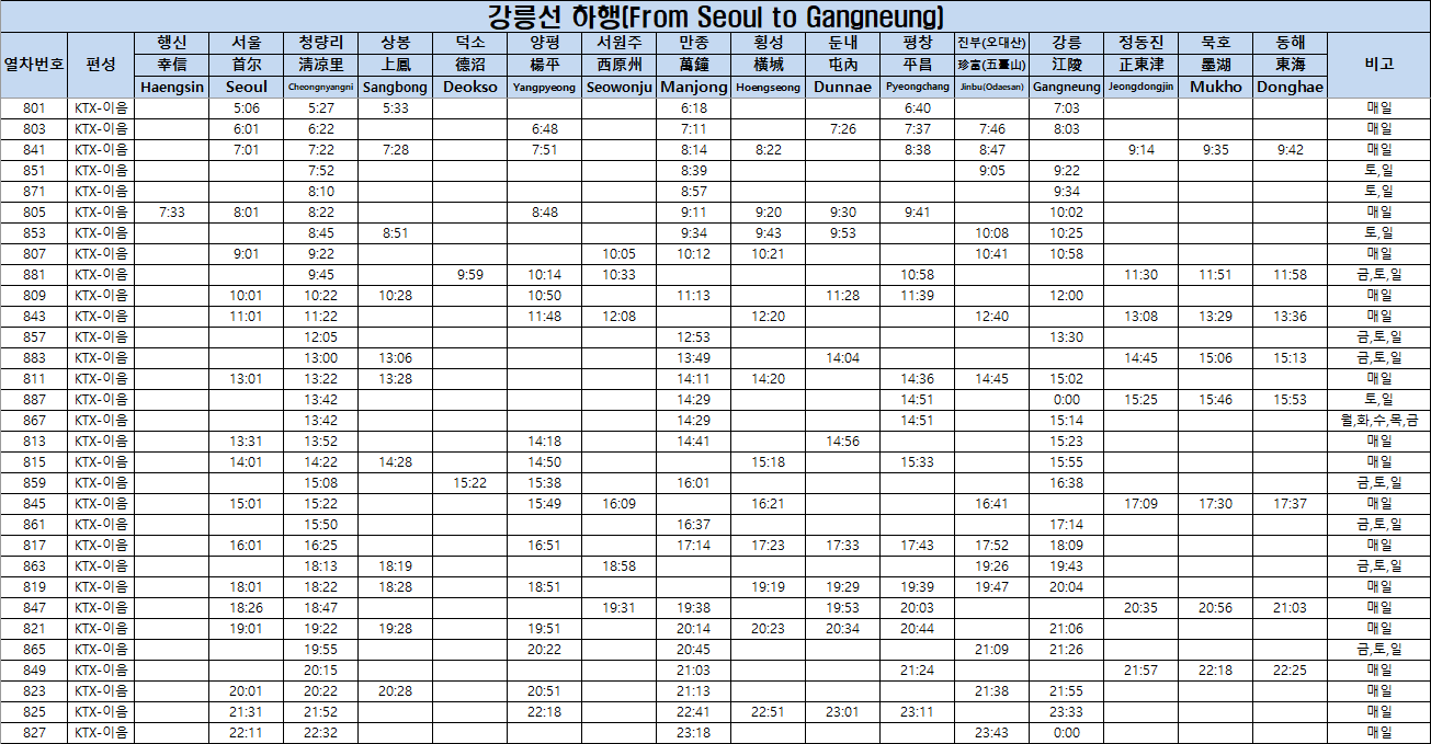행신역/서울역/청량리역 → 동해역
