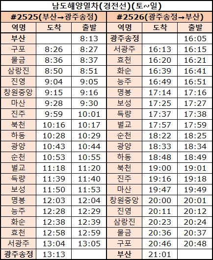 경전선 남도해양관광열차가 운행되는 기차시간표를 안내드립니다.
