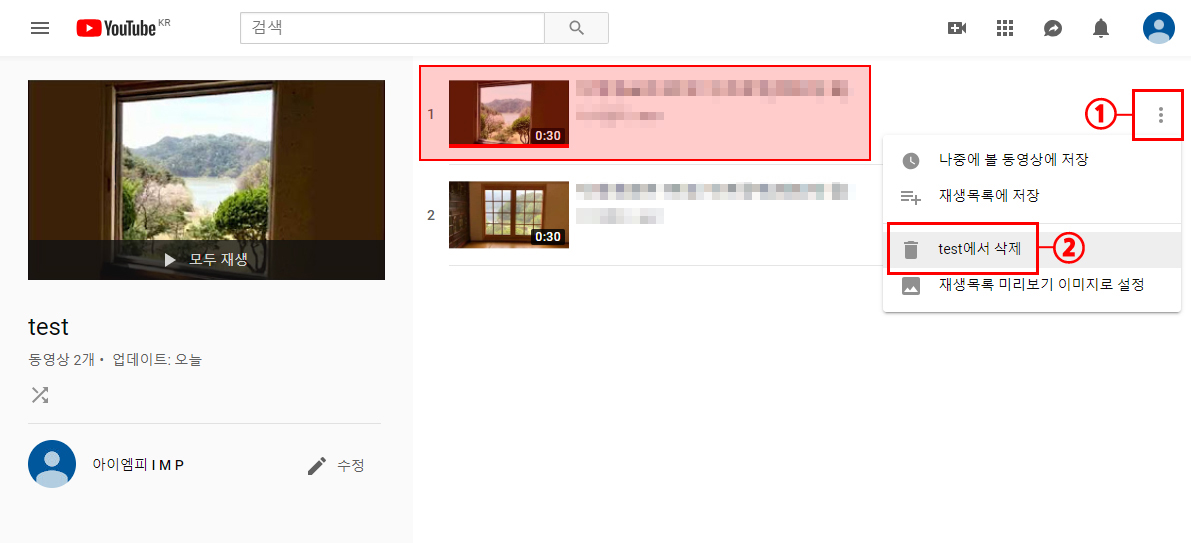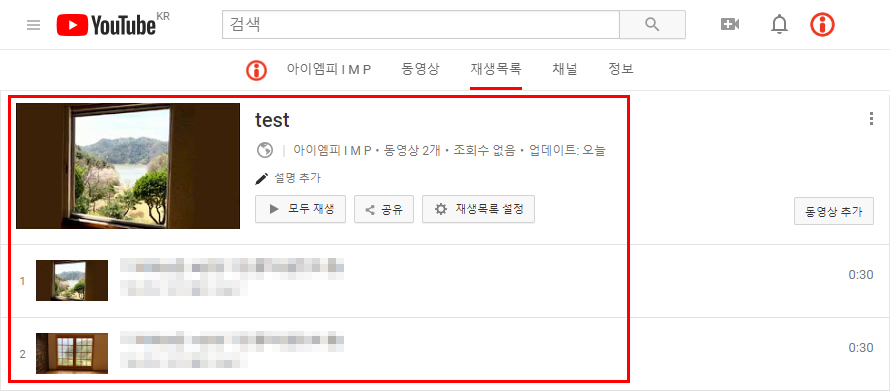 6. test 재생목록에 선택한 동영상이 추가됩니다.