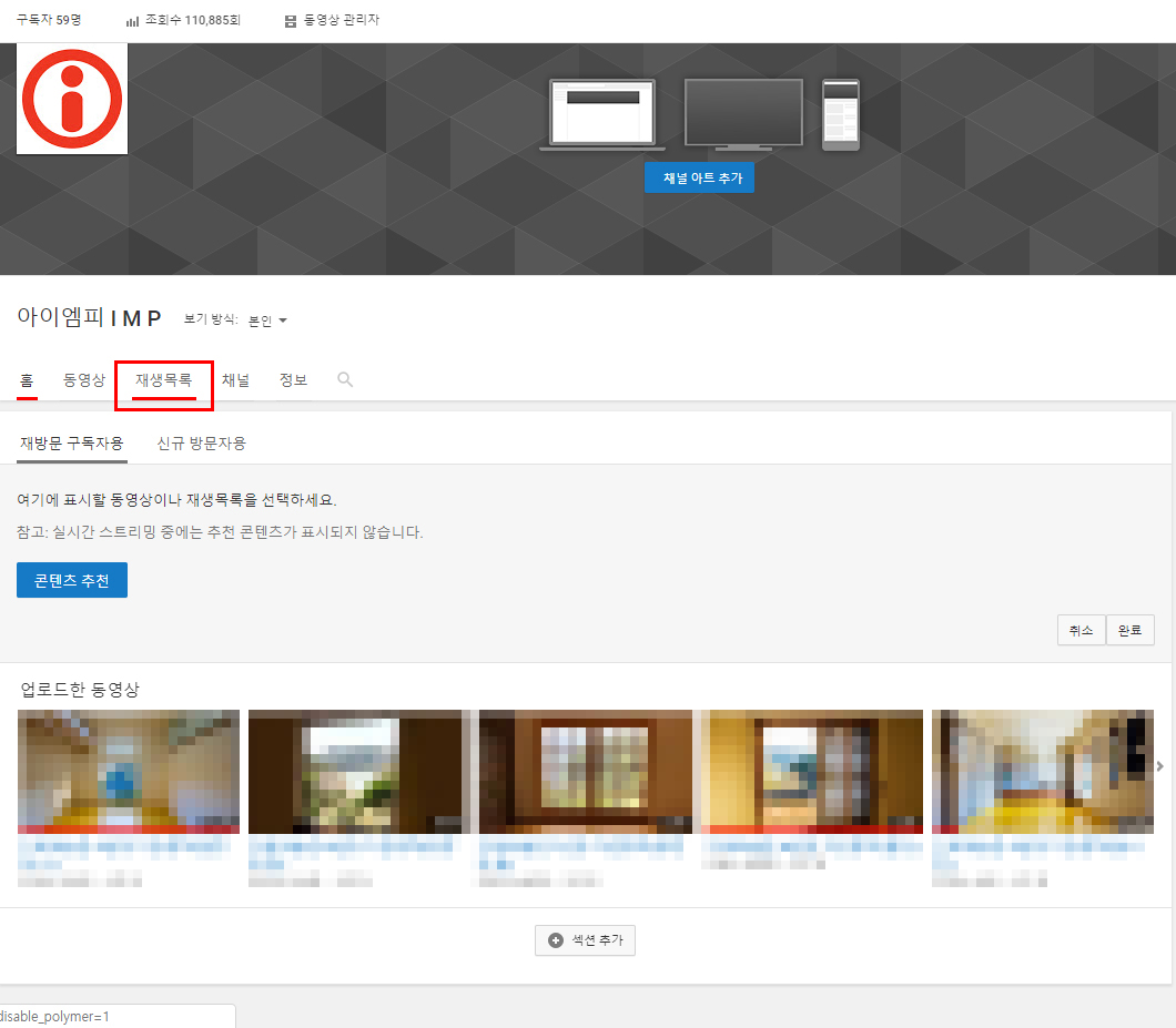 3. 상단 탭에서 재생목록을 클릭합니다.