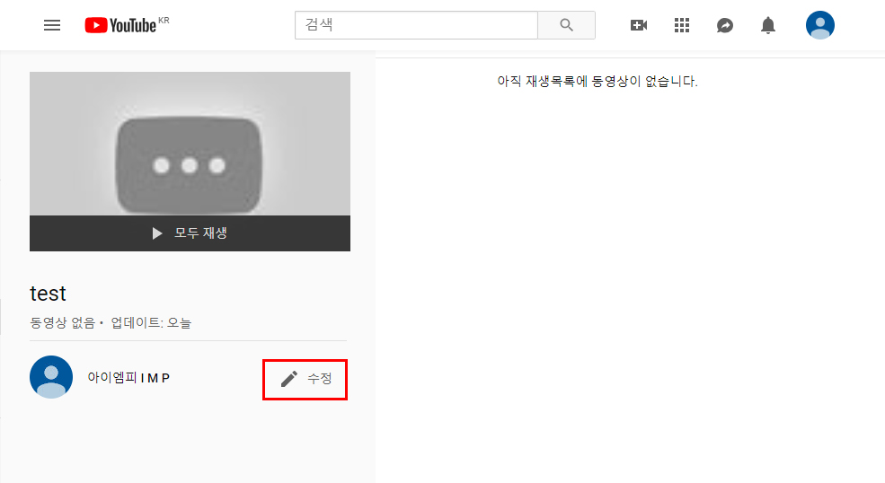 7. test 제목으로 된 빈 재생목록 생성을 완료하였습니다.